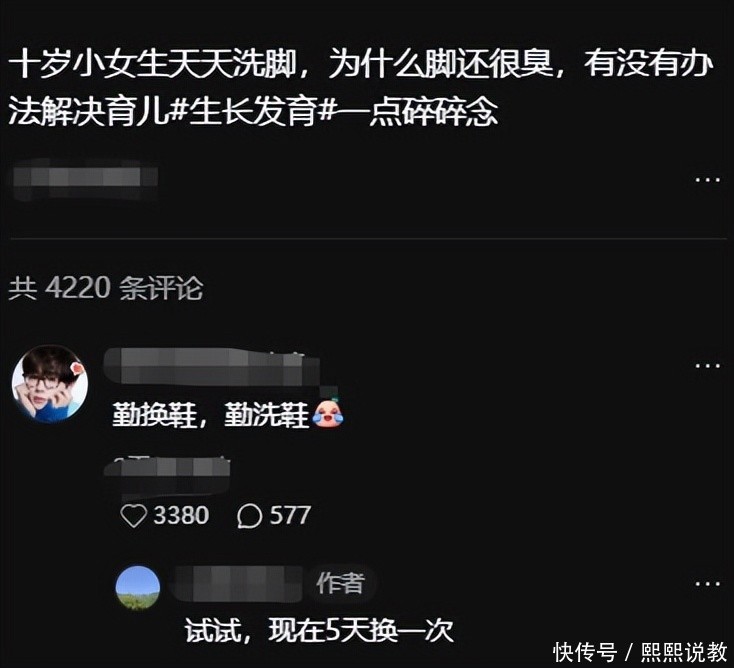她发现自己家的小女生10岁,每天放学回家都会洗脚,但为什么还是会散发出很大的味道?有没有办法解决呢?看来大家是被这位女同学身上的气味困扰了很长一段时间。