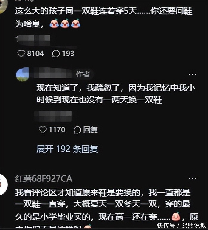 但没有想到其他网友也非常震惊,大家说上学的时候我永远都是一天就换一次新鞋子的,把那天脱完的鞋子拿到有阳光的地方暴晒,然后再穿其他换洗的鞋子。