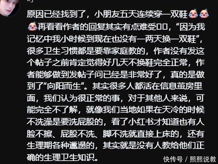 其实已经很大了,她同一双鞋连着穿5天,家长竟然还要问为什么会有味道。家长也认错说她疏忽了,因为从小在她的记忆里面,从来没有什么一天两天。